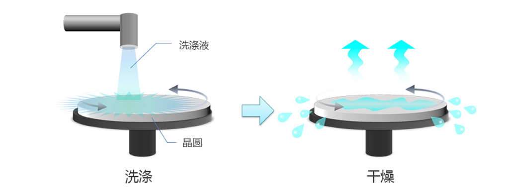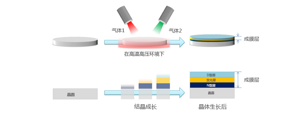 接下來是“晶體生長”。在這里,我們在晶圓上制作用于發光作為LED的薄膜。頂部是過程的俯視圖,底部是橫截面。在晶片周圍的高溫高壓環境下吹入氣體,并通過化學反應在晶片表面上沉積形成薄膜。這樣重復多次以制作多層薄膜結構。
